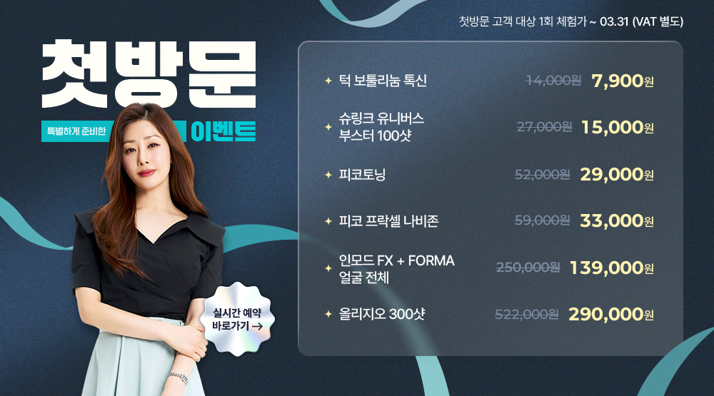 토핑 (택 1) : 올리지오 300샷 / 볼뉴머 300샷 / 쓰리딥 얼굴 전체 / 브이로 3000샷